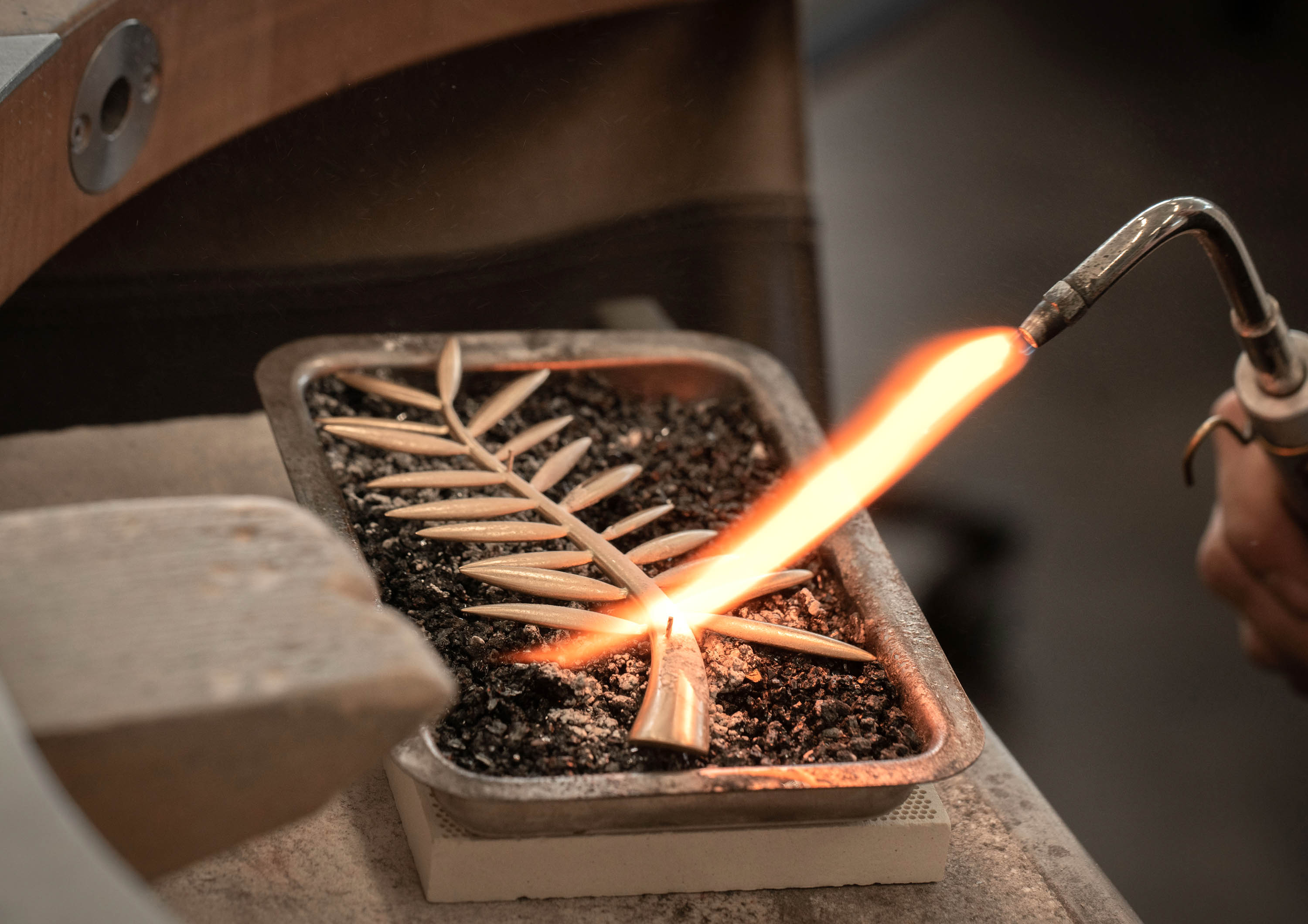 وتتبع هذه المرحلة عمليات أخرى دقيقة من تنظيف العناصر المفصولة يدويًا وتلميعها، إلى تجميع كل ورقة ذهبية على الساق في موقعها الصحيح باستخدام لهب الشعلة، ولا تكتمل السعفة قبل الخضوع لعملية التلميع النهائي ومن ثم حفر قاعدة الكريستال بواسطة قاطع ماسي لإعداد مكان تثبيت السعفة بدقة متناهية.