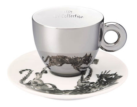 كؤوس اسبريسو: هذه الكؤوس معكوسة، تعكس القطط والجمال، رسمت على الأواني والصحون بطريقة مبهرة، لها تأثير سحري من تصميم William Kentridge.