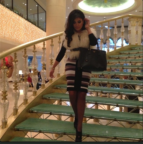 مثلا، عندما كانت تتسوق برفقة صديقتها مها في دبي مول ارتدت فستانا قصيرا يظهر تفاصيل جسدها الممتلئ، بلونه الأزرق مع لمسات من الأبيض، واختارت له حقيبة يد كبيرة الحجم مصنوعة من الجلد، وكانت باللون الأبيض مع اللون الأسود في الحواف.
