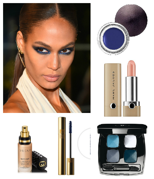 عيون دخانية مذهلة: طبق خافي العيوب Re(Marc)able Full Cover من Marc Jacobs Beauty، حددي حاجبيك وابرزيهما مع Perfectly Defined Long-Wear Brow Pencil من Bobbi Brown. انتقلي بعدها إلى العيون مستخدمة الآيلاينر الأزرق الكريمي على كل من خط الرموش السفلي والعلوي Crème Eye Liner بدرجة Bright Blue من Laura Mercier، وقومي بمزجها بشكل جيد بريشة نظيفة منتقلة لأعلى الجفن، ثم استخدمعلبة الظلال Les 4 Ombre بدرجة Fascination من Chanel، استخدم قليلا من الظل الأبيض البراق في الزاوية الداخلية للعينين ومنطقة تحت الحاجبين، وبالظل الأزرق الغامق عززي الكحل الأزرق على الجفن، وبريشة نظيفة وبالظل الرمادي أضيفي اللون على جفن العين المتحرك بمزجه جيدا بالظل الأزرق وزاوية العين الخارجية بشكل مرفوع وومشوق، وأيضا على خط الرموش السفلي. أضيفي بعدها الكحل الأزرق المشرق داخل عينيك باستعمال قلم Crayon Eyeliner من Dior، وأخيرا اغمري رموشك بضربات غنية بالماسكارا الزرقاء الداكنة من Yves Saint Laurent.
