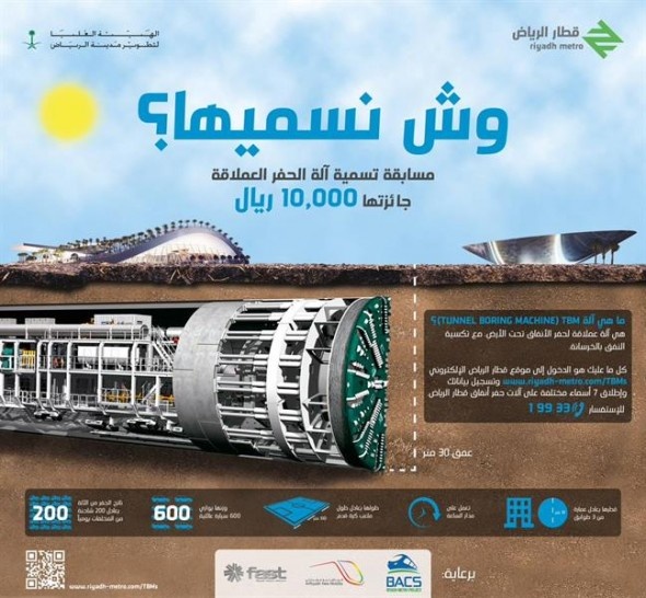 مسابقة "وش نسميها" تطلقها الهيئة العليا لتطوير مدينة الرياض اليوم الأحد، وهي عبارة عن مسابقة لاختيار أسماء آلات حفر الأنفاق العملاقة TBM، والتي جرى تصنيعها في كبرى المصانع العالمية خصيصاً للمشروع، وجار نقلها وتركيبها في مواقع العمل تمهيداً لإطلاق أعمالها في الحفر في القريب العاجل إن شاء الله.