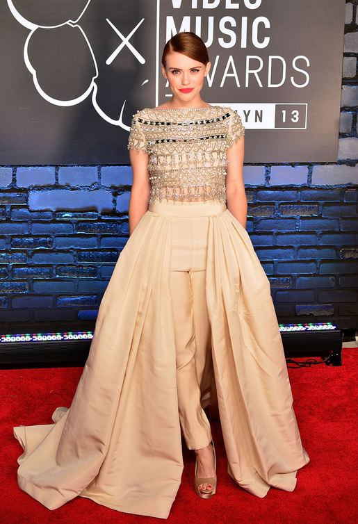 - إختارت الممثلة الأميركية Holland Roden تصميماُ عصرياً لفستان عروس. وهو يتميز باللون البيج وبالقصة الني تجمع بين البنطلون العملي والتنورة الانثوية مع توب غاية في الاناقة والشياكة.