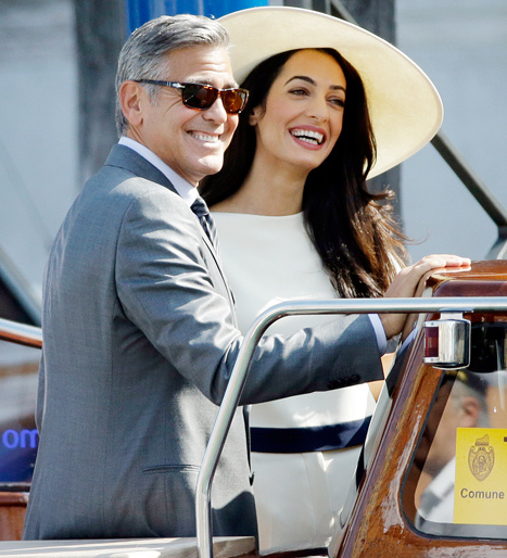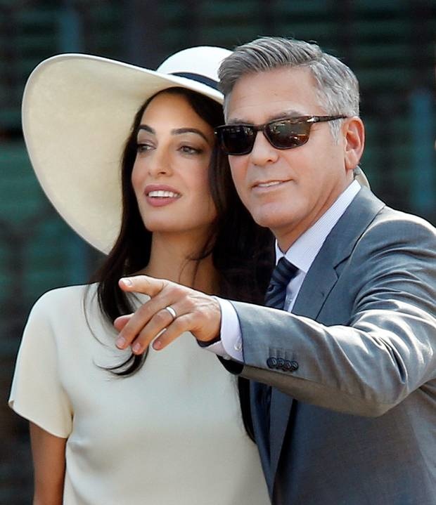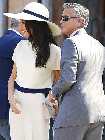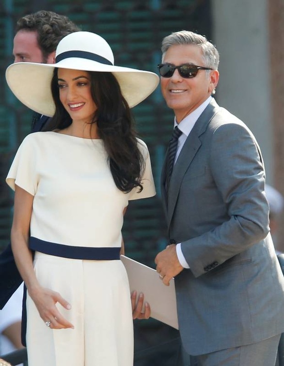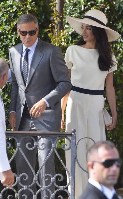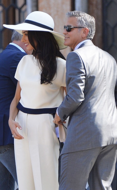 إختارت أمل علم الدين ان تجمع إطلالتها في الحفل الرسمي الذي أقيم أمس في بلدية البندقية، بين الأناقة والرقي ،فظهرت في تصميم "أوف وايت" كلاسيكي مميّز نسّقته مع قبّعة كبيرة باللون نفسه من تصميم أوسكار دو لا رينتا، أما جورج كلوني فإختار بدلة رماديّة للتوقيع على عقد زواجهما.
