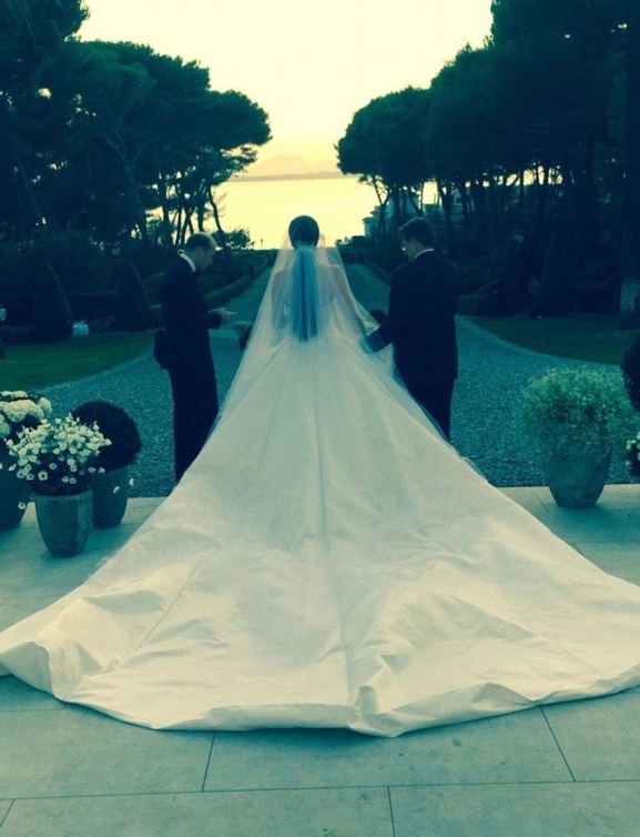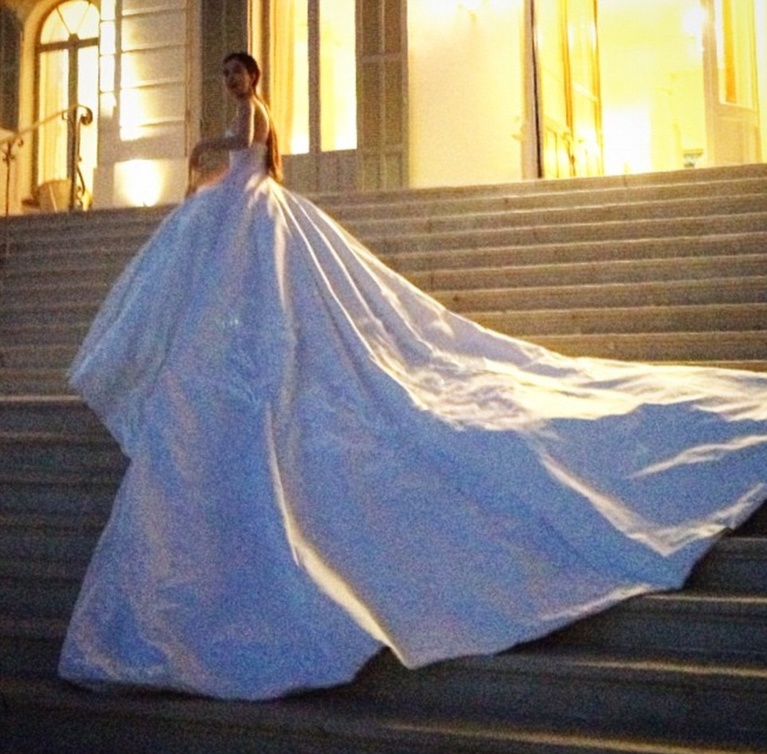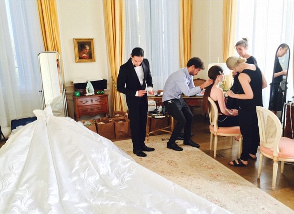 واختارت العروس فستاناً ملكياً من تصميمات "أوليفر ذيسكنز" ويتكون من نحو 35 مترا من الحرير الخالص، وذيل بطول 15 قدما، وكلفت خاماته دون حساب التصميم، ما بين 250 إلى 300 ألف دولار.