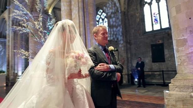 تم الإحتفال بهذه المناسبة في قصر إنكليزي قديم بأجواء خيالية حالمة في منطقة Yorkshire شمال انكلترا. وعلى وقع أغنية كتبها خصيصاً ليوم زفافه تقدّمت العروس برفقة والدها الإسترالي لتضع يدها بيد عريسها بأجواء تخطف الأنظار.