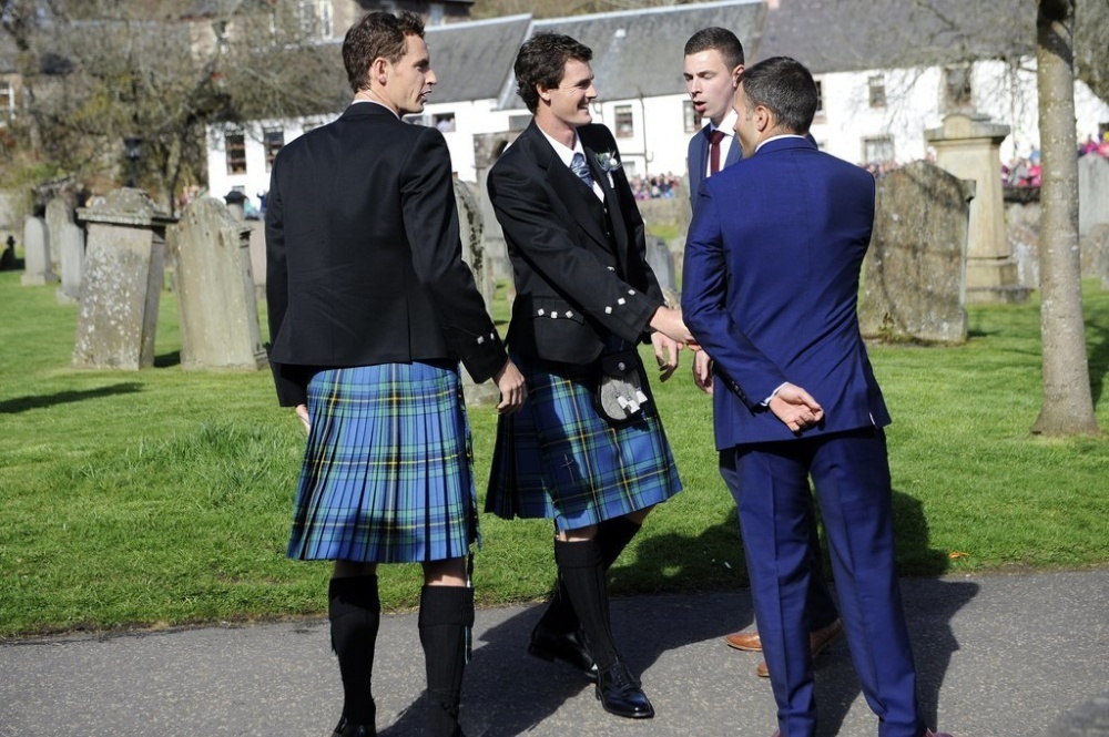 العروس كيم سيرز بدت أنيقة وجميلة للغاية بفستان زفاف جميل مزخرف بقطع من كريستال سواروفسكي (Swarovski) من تصميم مصممة الأزياء جيني بيكهام (Jenny Packham)، مصممة الأزياء جيني بيكهام قامت أيضا بتصميم فساتين وصيفات الشرف في حفل الزفاف وهي فساتين طويلة وأنيقة ذات لون وردي، بينما ارتدا العريس الزي التقليدي الاسكتلندي في حفل الزفاف وأهم ما يميز هذا الزي هو التنورة الاسكتلندية التقليدية.