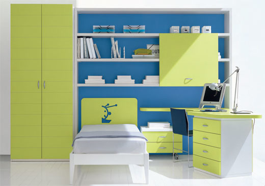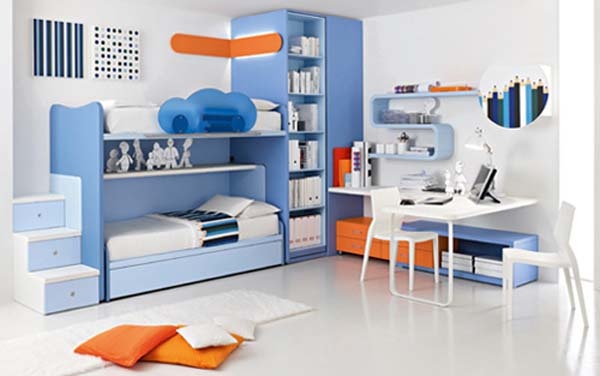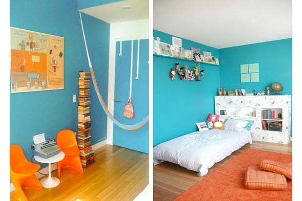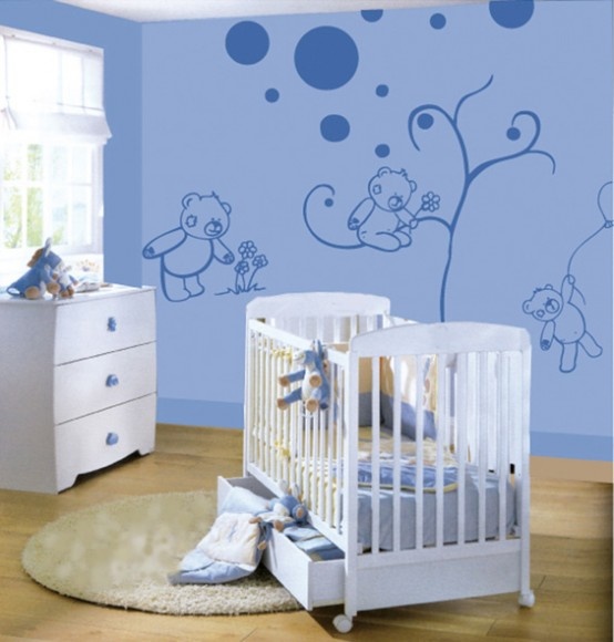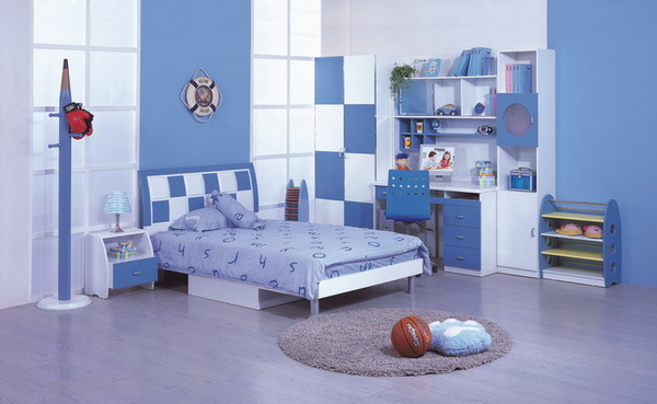 واللون الأزرق يعتبر من أكثر الألوان إراحة للعين والنفس خاصةً حين يتم مزجه بالأبيض ، فاجعلي الأزرق لونًا لأحد جوانب غرفة الطفل، والأبيض لبقية الجوانب ، واجعلي الأرضية من الباركيه بلون الخشب الطبيعي.