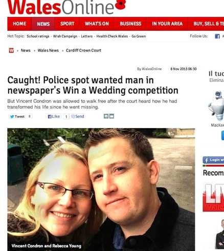 أمضى فينسنت كوندرون (36 عاماً) 7 سنوات هارباً من قبضة العدالة، ولم تتمكن الشرطة البريطانية القبض عليه الا عبر مشاركته في مسابقة لربح "زفاف الأحلام"، حيث ظهرت صورته مع خطيبته على صفحات الصحف المحلية.
