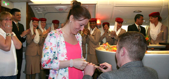 وفي التفاصيل إنه بعد وقت قليل من إقلاع طائرة إيرباص A380 من دبي طلب ستيوارت من أفراد طاقم الخدمات الجوية مساعدته على التقدم بطلب الزواج بطريقة مميزة إلى صديقته التي كانت ترافقه على الرحلة.