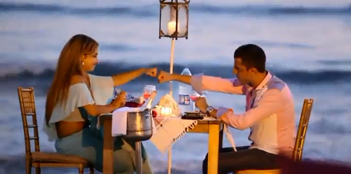 ودعا العريس خطيبته الى عشاء رومانسي على الشاطئ في المنطقة، وقصد مجمع الـ"Edde Sands" برفقتها لعشاء رومنسي بالتزامن مع غروب الشمس، ثم انتقلا بعدها عبر يخت إلى ميناء جبيل. وهناك كانت المفاجأة حيث تقدم لها راكعاً وطلب يدها، وما إن وافقت حتى بدأت الفرقة الموسيقية التي ظهرت فجأة بالعزف، كما بدأت الألعاب النارية بإضاءة سماء البحر بأجمل الأجواء وبحضور جميع الأصدقاء الذين شاركوا في تخطيط هذه المفاجأة مع العريس...