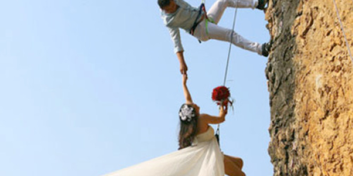 قام زوجان يهوان رياضة تسلّق الجبال بجلسة تصوير لهما على المنحدر في يوم زفافهما وهما يمارسان رياضتهما المفضلة،فتم إلتقاط مجموعة من الصور اعتبرها موقع shanghaiist الصيني الأجرأ والأخطر حتى الآن وألأكثر اختلافًا على مستوى صور الزفاف الأخرى التي تلتقط في الحدائق او على الشواطئ.