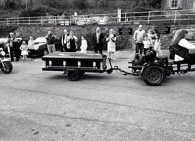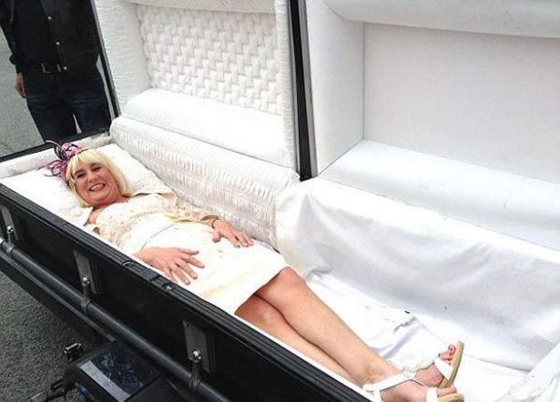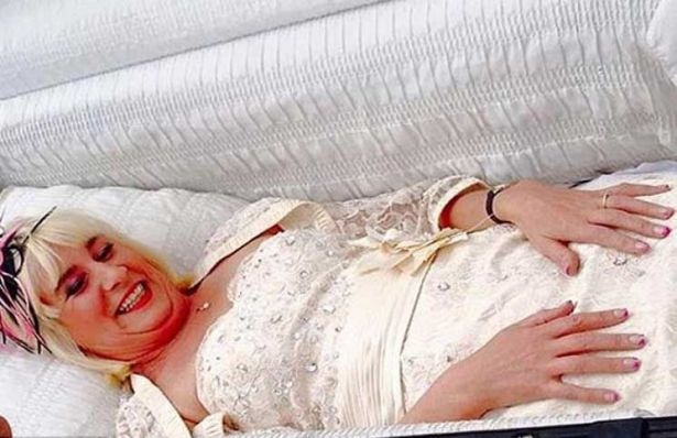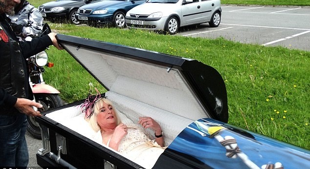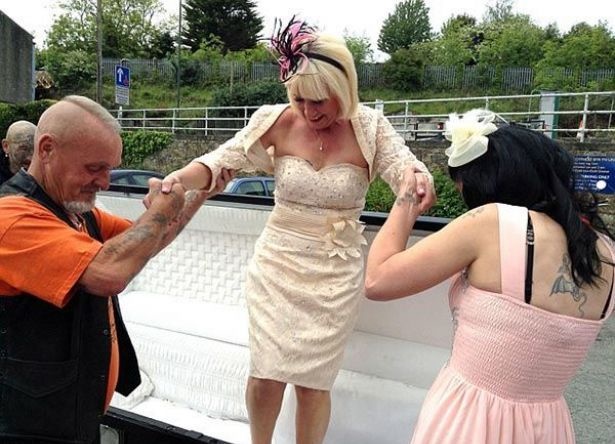زفت عروس تدعى جيني (58 سنة) الى عريسها كريس وهي نائمة في التابوت الذي يجره شقيقها عبر دراجته النارية إلى مكان الحفل.