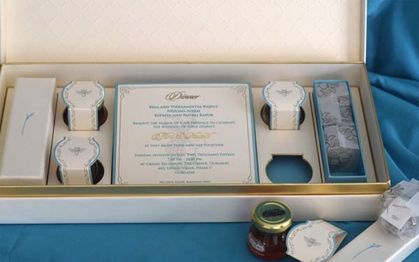 وقد أراد شاهيد ان تحمل بطاقة الزفاف الروح الهندية، فأضاف قطع الهدايا الى العلبة التي وضعت فيها البطاقة، وهي عبارة عن العسل والشاي المصنعين في الهند.