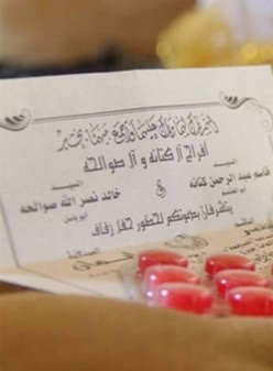 لم يتردد كل من الطبيب المنتصر والصيدلانية إيمان من الأردن بتصميم بطاقة دعوة لحفل زفافهما من وحي أجواء مهنتيهما، فقاما بابتكار البطاقة على شكل علبة دواء وضعا في داخلها ورقة هي بمثابة ورقة تفاصيل الدواء، بالإضافة الى بعض الحلوى التي تأتي على شكل دواء للإكمال الفكرة بالشكل المناسب.