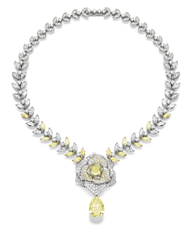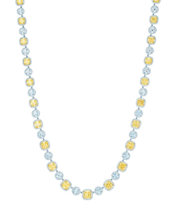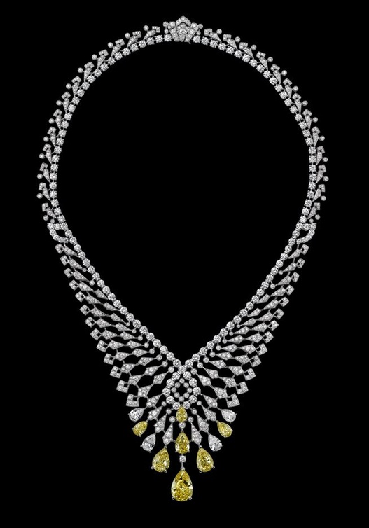 بين المجموعة التي إخترناها لك ايتها العروس وقع الخيار على ثلاث قلادات مزينة بالماس الأصفر، وهو اللون الذي لا يقاوم في حبيبات الماس وخصوصاً في حفلات الزفاف، حيث يضفي رونقه جمالاً إضافياً الى إطلالة العروس، كما انه لون لا يقاوم بجماله وبتأثيره الرائع في المجوهرات.
