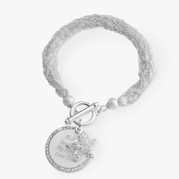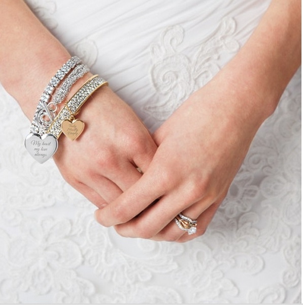 إليك سوار متعدد السلاسل يتميز ب12 سلسلة أنيقة بقفل رائع مصقول على شكل قلب من الفضة منقوش عليه بعض الأمثلة المفضلة لديك أو الأحرف الأولى لكِ ولزوجك أو موعد الزفاف في إطلالة رائعة وجديدة، كما يمكنك أيضا إضافة شعار أو تصميم لزفافك على هذه القطعة النادرة والأنيقة.