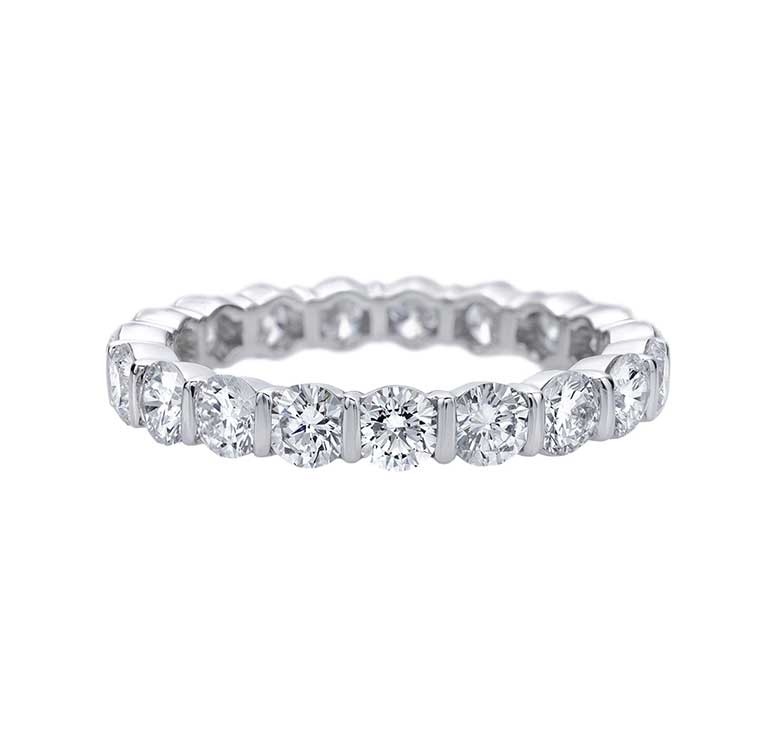 تضم مختاراتنا خاتماً من "هاري وينستون Harry Winston " يعرف بإسم خاتم "بار-سيت إيتيرنيتي Bar-Set Eternity". أناقة هذا الخاتم تشع بالبريق واللمعان وذلك بفضل ما تضمه من فصوص ماسية دائرية تم استخدامها في تطعيم الخاتم المصنوع من البلاتين. قطعة لا شك انها ستأسرك بجمالها المبتكر بإتقان وستغريك باقتنائها وارتدائها.