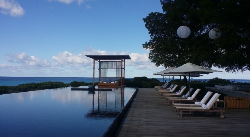 فندق "Amanyara" في جزر توركس وكايكوس: فندق "Amanyara" يحتوي على حوض سباحة طوله 164 قدم ويطل على شاطئ البحر، ويوجد بجانب حوض السباحة مجموعة من المقاعد المريحة التي يمكنك الجلوس عليها والاستمتاع بتناول المشروبات الخفيفة.