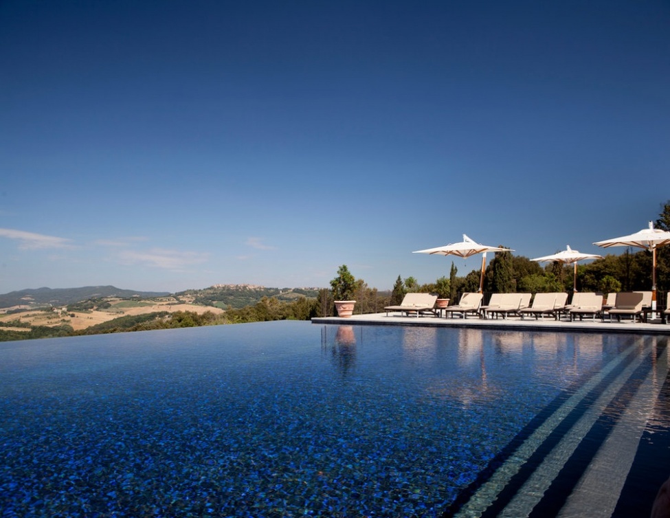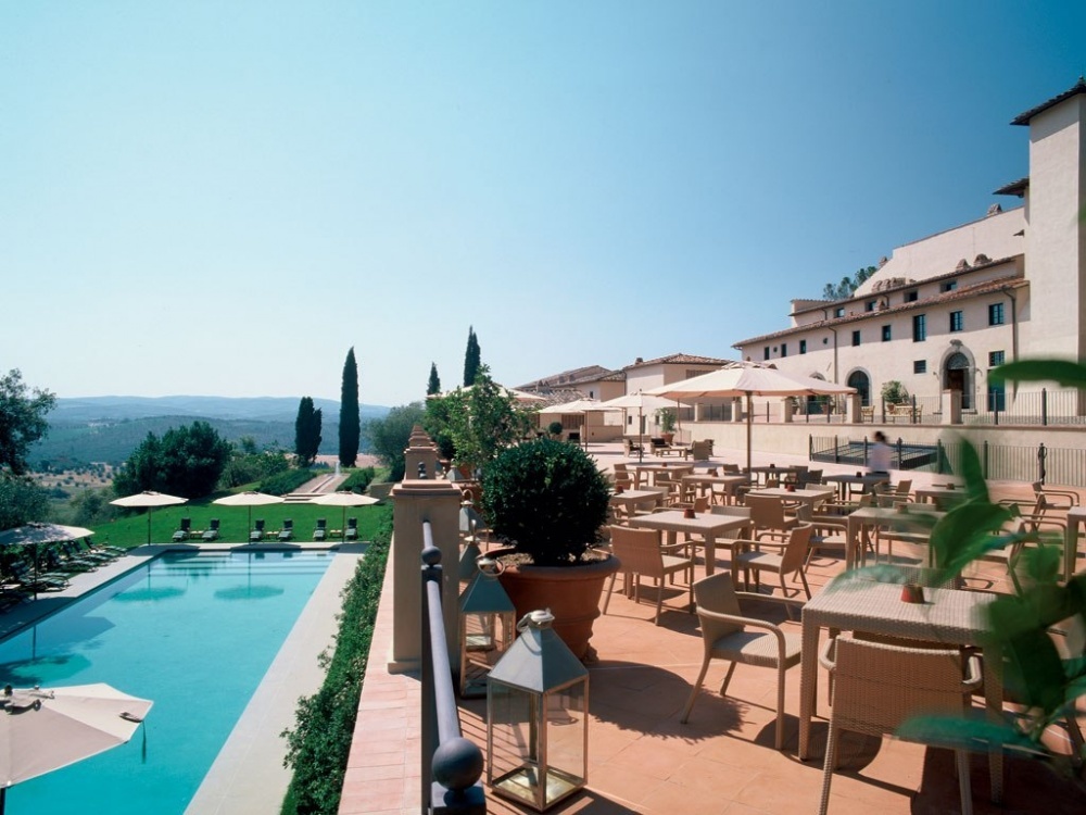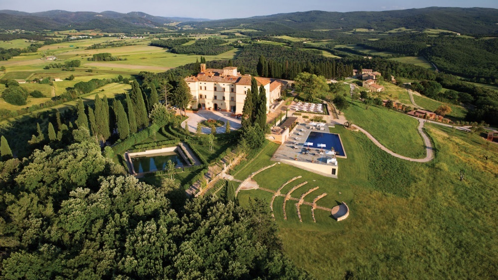 فندق " Castello di Casole" في مدينة " سيينا" في إيطاليا: هذا الفندق عبارة عن قلعة جميلة تم تحويلها إلى فندق، وهو يحتوي على حوض سباحة جميل محاط من كل جانب بحدائق واسعة وممتدة.