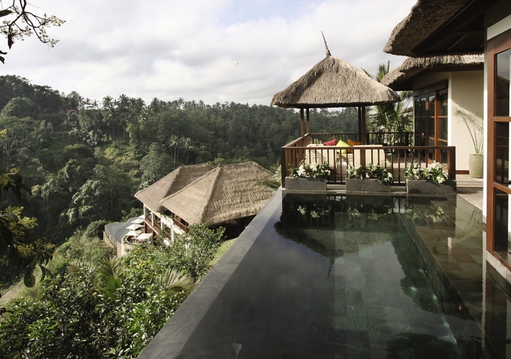 فندق " Hanging Gardens" في بلدة " Ubud" في جزيرة "بالي": في هذا الفندق يوجد حوض سباحة كبير مكون من طابقين، الطابق العلوي يتصل بالمقهى/البار الخاص بالفندق والطابق السفلي يتصل باستراحة جميلة يمكنك أن تتناول فيها العشاء، وبالقرب من حوض السباحة المكون من طابقين (مستويين) غالبا ما يقام عدد الاحتفالات أو المناسبات الخاصة (مثل حفلات الزفاف).