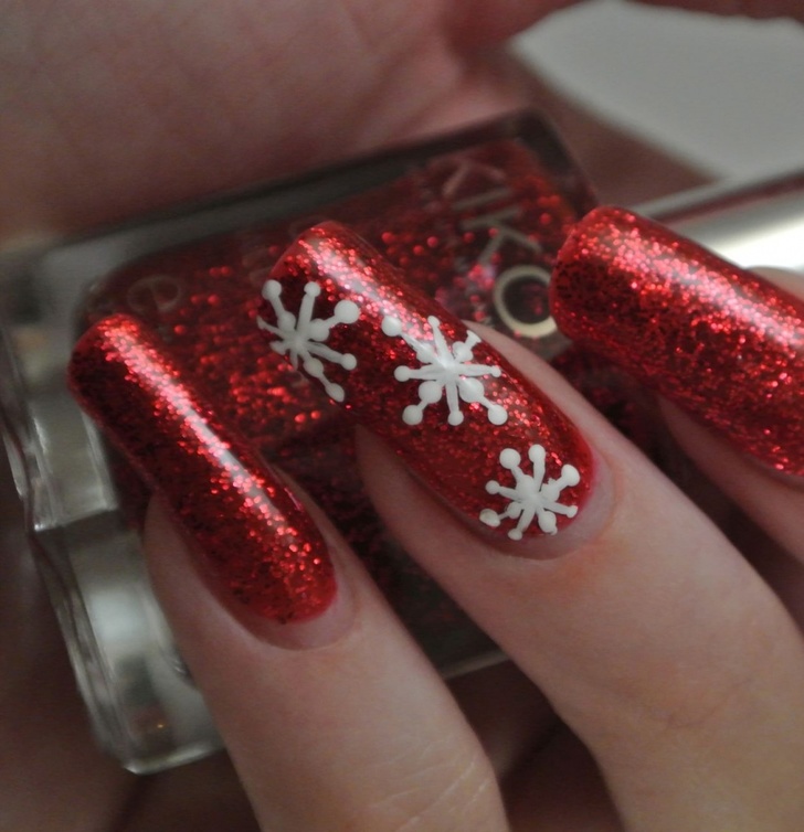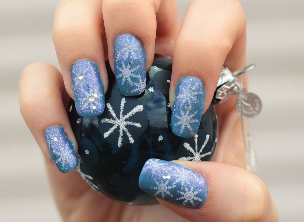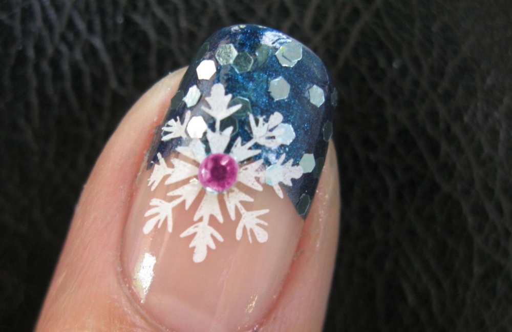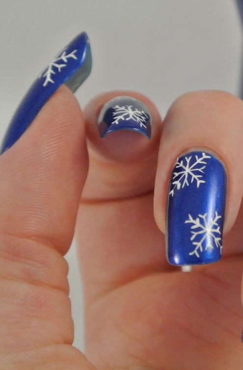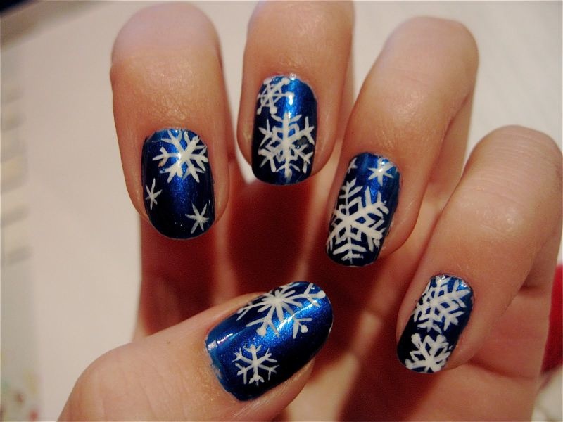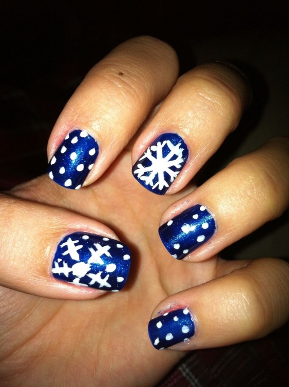 -أو اعتمدي اللون الكحلي البراق المزين برسوم حبيبات الثلج،لإطلالة عصرية لأظافرك.