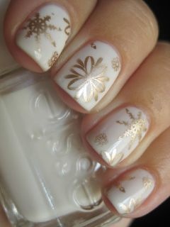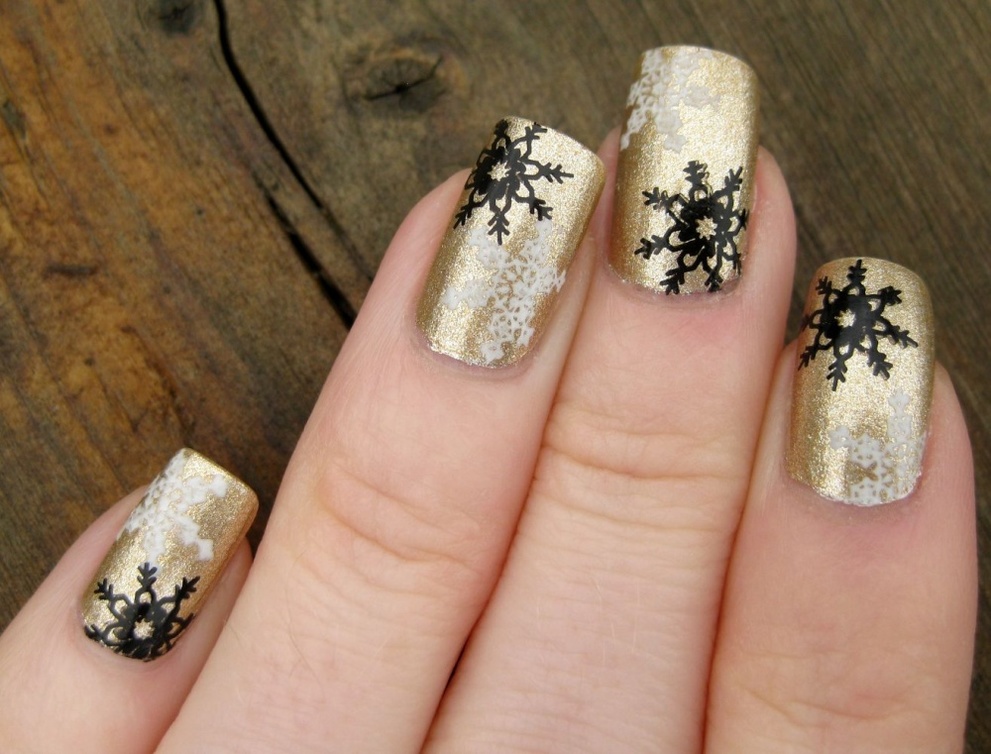 -أما اللون الذهبي الأنيق المزين بالرسومات البيضاء والسوداء يضفي جمالاً مميزاً إلى أظافرك.