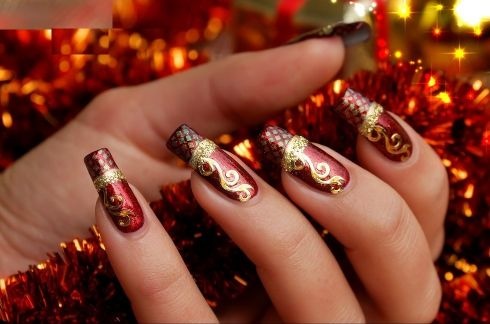 -أما للحصول على إطلالة قمة في الرقي لأظافرك، إعتمدي على النقوش الذهبية الجذابة فوق الطلاء الأحمر.