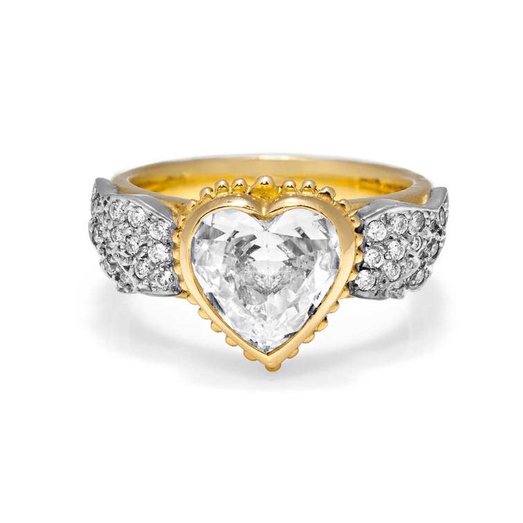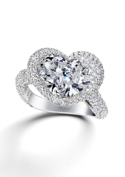 إضافة إلى ذلك، تضم مختاراتنا أيضا خاتم الخطوبة من "شوبارد Chopard " يطلق عليه اسم خاتم الخطوبة " Passion for Happiness ". يضم قطعة ماسية كبيرة على شكل قلب محاطة بفصوص ماسية أخرى صغيرة زادت من تألق الخاتم وجعلته يبدو مبهرا للغاية.