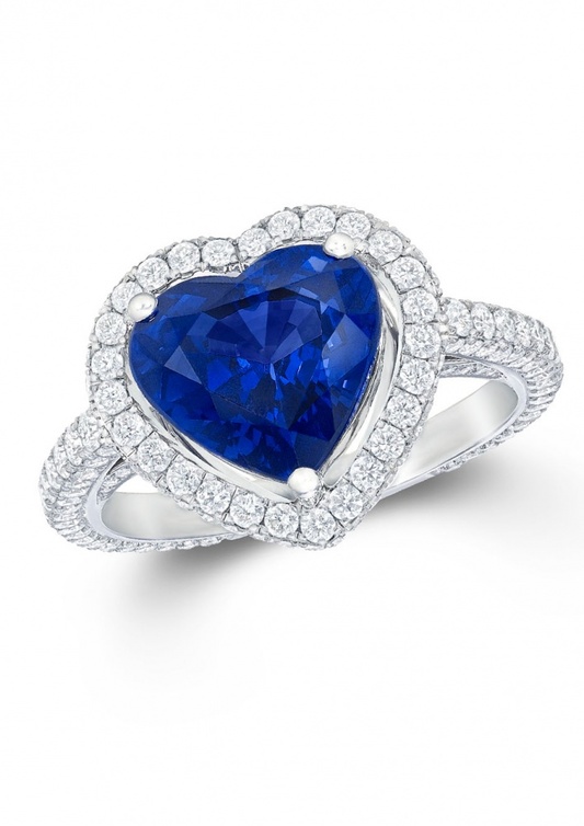 لدينا خاتم الخطوبة من "غرافGraff " بتصميم رائع على شكل قلب من الياقوت الأزرق محاط بفصوص ماسية مستطيلة الشكل؛ ما زاد من جمال حلته المبهرة وجعل منه قطعة تنبض بالحيوية و البهجة.