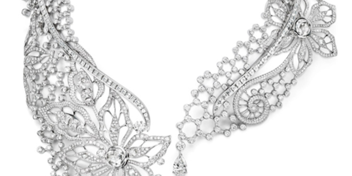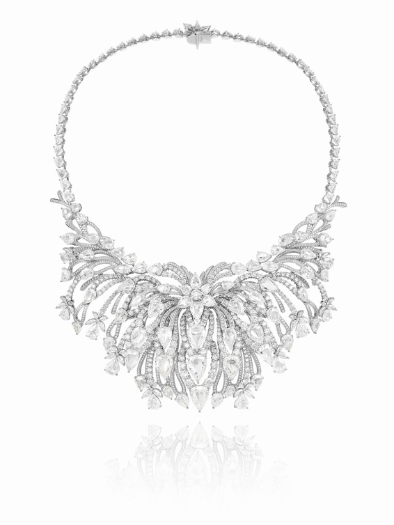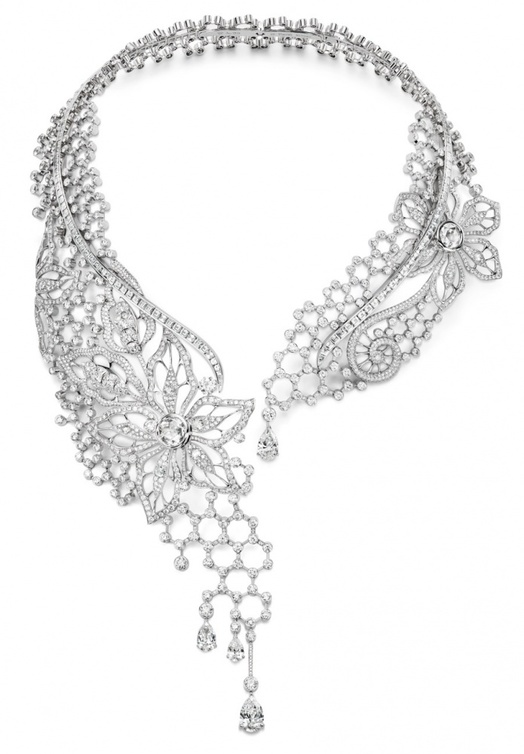 إخترنا أيضا قلادة "بياجيه Piaget" تعرف باسم قلادة "كوتور بريسيوز Couture Precieuse ". وقد جاء تصميم هذه القلادة مبتكرا جدا على شكل تطريزات مزخرفة بفصوص ماسية؛ حيث تمت صياغتها في أروع و اجمل حلة لها من الذهب الأبيض. شكل القلادة جميل للغاية بفضل الأسلوب المميز في تشكيل الأزهار و تطعيمها بالفصوص الماسية البرلنتية و المستطيلة والكمثرية و قطع "روز Rose-cut" في تنسيق جميل ومذهل للغاية.