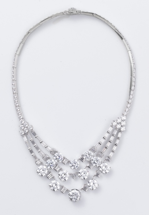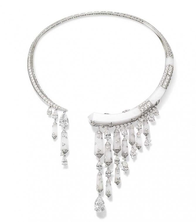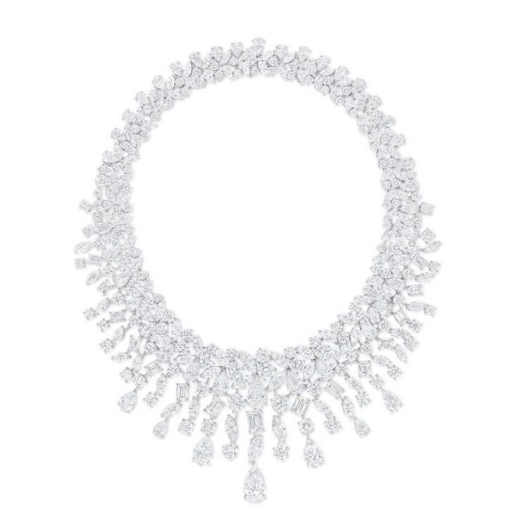 لدينا بداية قلادة "شوباردChopard " من تشكيلة "ريد كاربت Red Carpet" و تعرف بإسم قلادة "ريفييرا Riviera". تم تصميم هذه القطعة الفاخرة بأسلوب دقيق ورائع حيث تتألف من قطع ماسية مختلفة الأشكال تشمل البرلنتية و الماركيز و قطع "روز Rose-cut" والكمثرية؛ ما اعطى للقلادة مظهرا في غاية الأناقة و الجمال.