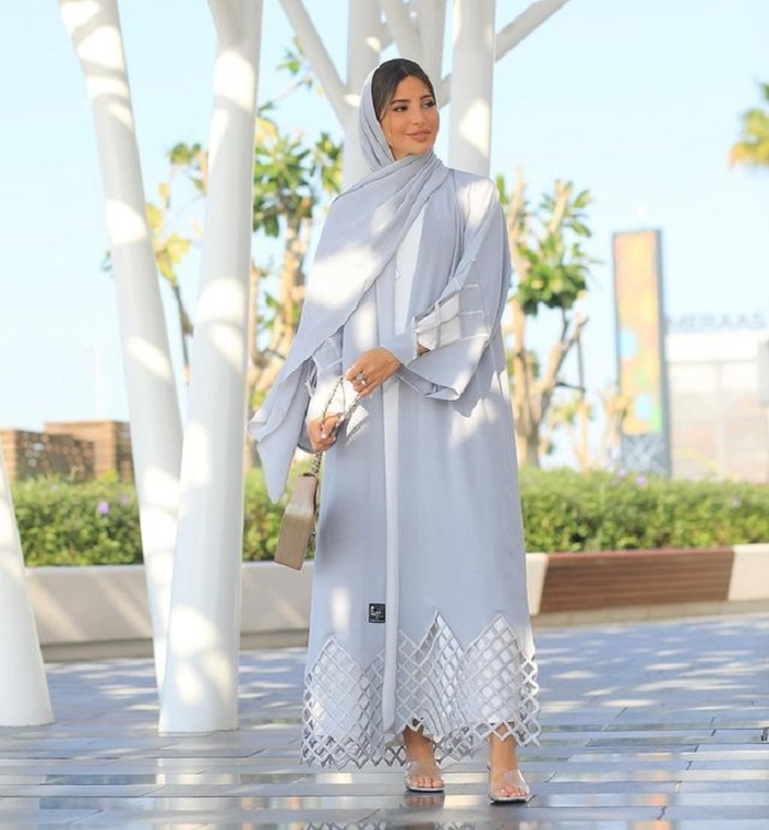على ما يبدو أنّ فاطمة حسام من عشاق اللون البنفسجي فمعظم اطلالاتها بالعبايات جاءت بهذا اللون وخصوصا الفاتح. اختارت عباءة بأكمام واسعة وجاءت مفتوحة بأشكال على أطرافها ونسقت معها اللون الأبيض من Alsamha Boutique.
