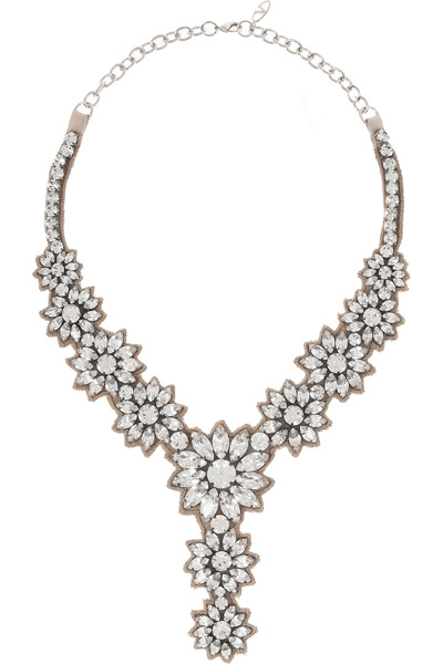 لدينا في تشكيلتنا التالية فستان الزفاف من تصميم اوسكار دي لا رنتا Oscar dela Renta من الدانتيل الابيض المزركش بالازهار، نقوم بتنسيقه مع حذاء تشيلسي باريس Chelsea Paris بالوان الاسود والفضي والذهبي، بالاضافة الى حقيبة ألكسندر مكوين Alexander McQueen باللون الأسود مغلفة بعروق أزهار ذهبية. وفيما يخص المجوهرات لدينا أقراط بياجيه المصممة على شكل أزهار وقلادة فالنتينو Valentino المصممة على شكل أزهار تم تطريزها على قماش من الساتان الحريري بيجي اللون؛ وذلك لاستكمال تشكيلتنا المميزة الرائعة.