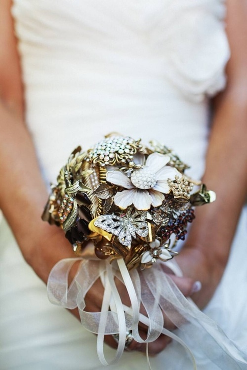-ولم نجد باقة تعكس أناقة هذه الإطلالة أفضل من هذه الباقة التي تجمع الاكسسوارات الكريستالية المميزة التصميم مثل الوردة والفراشة والتاج وغيرها المزينة بحبيبات الكريستال واللؤلؤ من تصميم Brooch Bouquet.