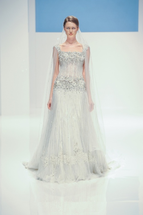 - لقد إعتمدت قصة حورية البحر لهذا الفستان الذي يأتي ضيقاً على الجسم، ويتسع تدريجاً نحو الأسفل. وتميز الجزء الخلفي من هذا الفستان بطبقة قماش ثانية من الأورغانزا والدانتيل. مع إدخال قماش "الغيبير" المطرز باللؤلؤ والكريستال.