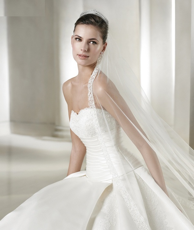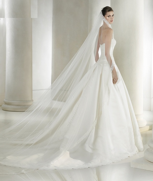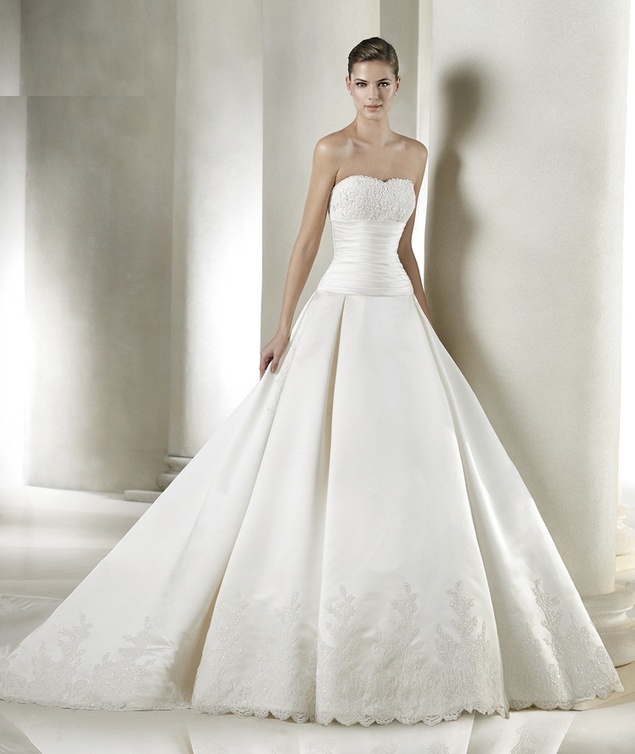 فالفستان هو من مجموعة ربيع 2015 من دار San Patrickيتميّز بقصة الخصر التي تبرز رشاقة العروس، وقد استعين لتنفيذه بقماش الساتان الناشف.ويضفي التطريز الأنيق في القسم السفلي من الفستان جمالاً إستثنائياً عليه.
