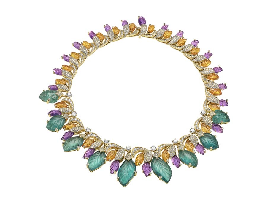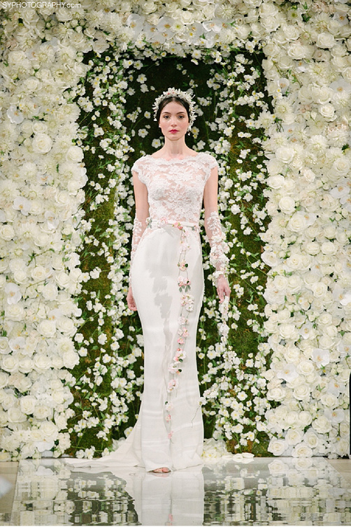اخترنا بداية فستان الزفاف من "ريم عكرا"؛ يتميز بقصة رائعة مصمم في جزئه العلوي بقطعة من قماش الدانتيل المزهر بلون أبيض؛ مما جعله حقا يتميز بسحر فريد ومذهل. ولإضفاء مزيد من التألق على هذا الفستان الأنيق، اخترنا له قلادة من "بلغري Bulgari" تعرف بإسم قلادة "فور سيزنز سامر Four Seasons Summer"؛ و هي قلادة رائعة مصصمة من الذهب الأصفر وأحجار كريمة تشمل الزمرد، وعقيق السبسارتايت والجمشت و مرصعة بفصوص ماسية دائرية و اخرى برلنتية الشكل. لدينا أيضا أقراط من "بياجيه Piaget" يطلق عليها إسم أقراط "روز باشن Rose Passion " ستضفي مزيدا من الأناقة على هذه الإطلالة.