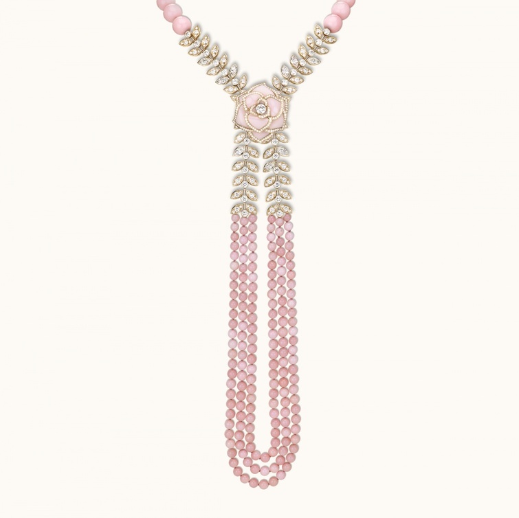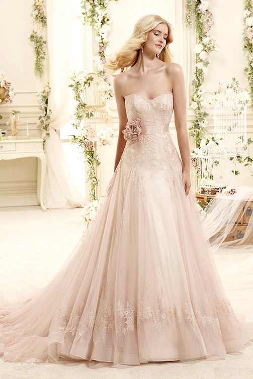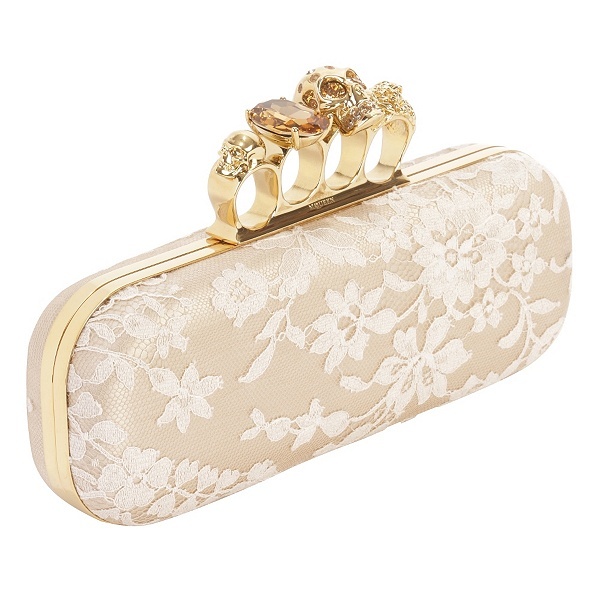 نبدأ إطلالتنا بفستان الزفاف من "كوليت Colet" و هو فستان أنيق و راقي جدا بقصة A-Line بدون حمالات و مميز بلونه الوردي الخفيف. نقوم بتنسيق هذا الفستان مع أكسسوارات جميلة و راقية تشمل صندل من "جيمي تشوو Jimmy Choo" يعرف بإسم صندل "بيلو غليتر ويدج Bello Glitter Wedge" اللامع بلون عسلي خفيف مع فيونكة زادت من جماله. إضافة إلى ذلك اخترنا أيضا حقيبة مربعة الشكل من "ألكسندر ماكوين Alexander McQueen" بلمسة من الدانتيل ولون عاجي ناعم ومقبض مفاصل الأصابع. لإضفاء مزيد من البريق و التألق على الإطلالة لدينا قلادة من "بياجيه Piaget " يطلق عليها إسم قلادة "روز باشن Rose Passion " وهي مبتكرة من الذهب الوردي والماس والأوبال الوردي بتصميم ناعم ومميز. اخترنا كذلك خاتم "ليني Linneys" مصنوع من الذهب الوردي مع فصوص ماسية باللونين الأبيض والوردي.