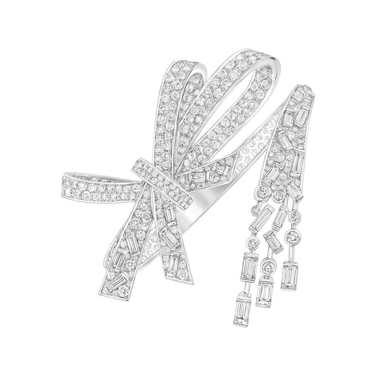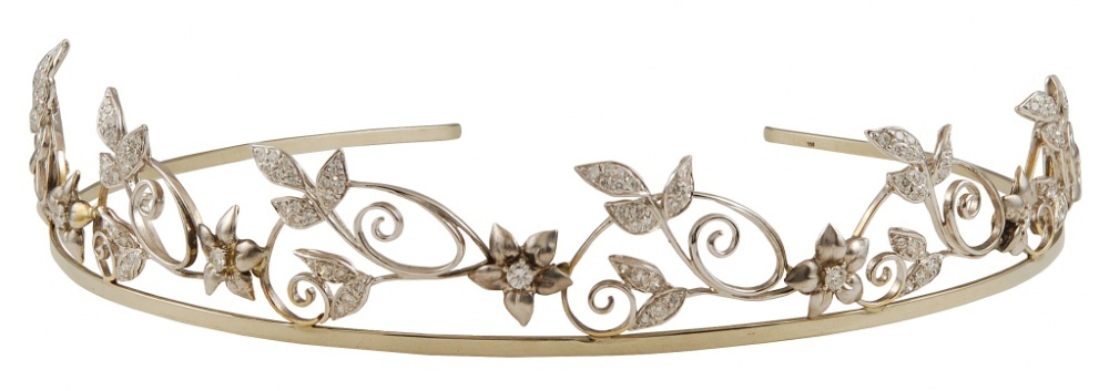نبدأ إطلالتنا انطلاقا من فستان زفاف اخترناه من "مارتينا ليانا Martina Liana"، و هو فستان جميل جدا سيتلاءم مع ذوقك ولا شك أنه سيناسب شخصيك وطبيعتك حيث يضفي ببساطته الراقية الكثير من التألق والأناقة المبهرة. نقوم بتنسيق هذا الفستان الرائع مع أكسسوارات مناسبة تشمل سوار "شانيل روبان Chanel Ruban" من تشكيلة "ليزانتمبوغيل دو شانيل Les Intemporels de Chanel"؛ و هو سوار من الذهب والماس. تضم أكسسواراتنا أيضا تاج "فريد ليتونFred Leighton " الماسي بحلة ناعمة مصممة على شكل أزهار ستضفي على الإطلالة مزيدا من البهجة والتألق.