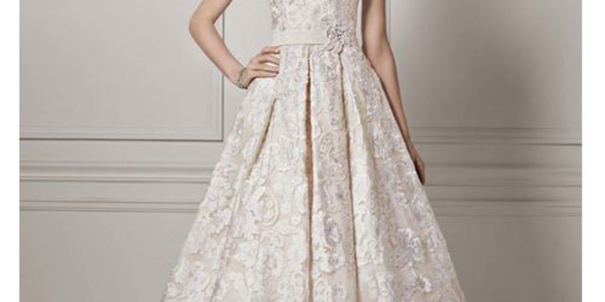 لدينا بداية فستان الزفاف من "أوليغ غاسيني Oleg Gassini" مكشوف الكتفين بتصميم A-CUT مزين بالأزهار ما أعطاه أناقة جميلة ورائعة.