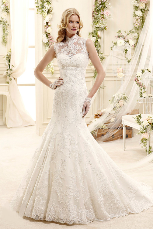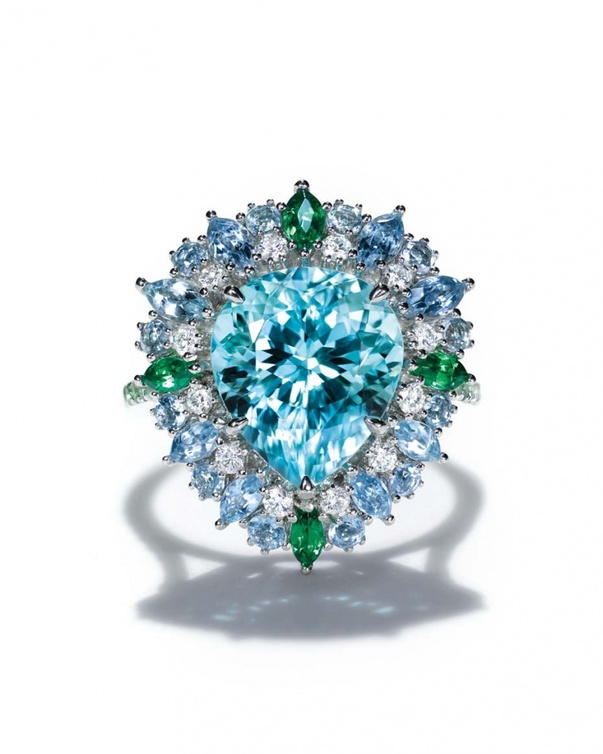 لدينا بداية فستان الزفاف من "كوليتColet " بتقويرة شفافة للعنق وبدون أكمام؛ عريض من الأسفل بقصة كلاسيكية راقية ومبهرة. إنطلاقا من هذا الفستان الجميل قمنا باختيار الأكسسوارات المناسبة التي ستتلاءم معه. اخترنا خاتم "تيفاني Tiffany" من تشكيلة "بلو بوكBlue Book "، وهو مصمم بأنواع مختلفة من الأحجار الكريمة على شكل زهرة في حلة تشرق بالحياة والجمال.