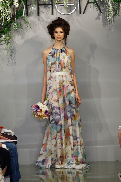 نعرض فستان زفاف من "إيلزابث فيلمورElizabeth Fillmore " وهو مكشوف الكتفين بقصة حورية البحر تم تصميمه من الساتان مع حزام جميل و طبعات للأزهار تضفي الكثير من التوهج الشبابي على الطلة. لدينا أيضا فستان الزفاف من "ثييرا Theia" يسمى أيضا بفستان "Fae" وهو من قماش الشيفون الحريري بألوان الباستل وطبعات للأزهار يبدو خفيفا لكنه يزخر في الوقت نفسه بالتألق والجاذبية.