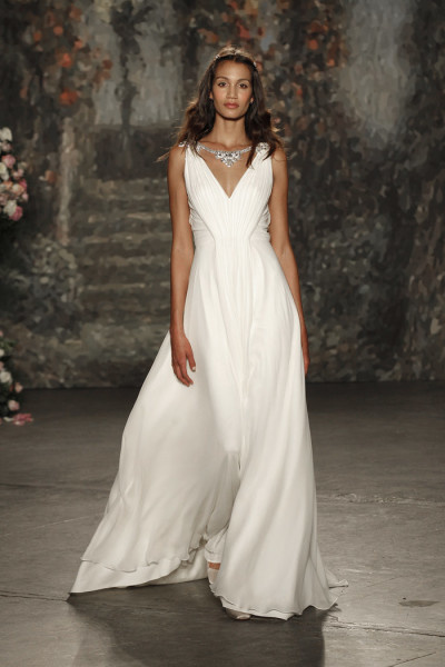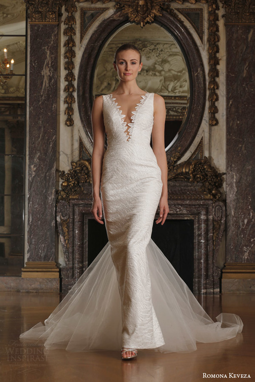 ويتميز فستان "رومونا كيفيزا Romona Keveza" من تشكيلة "لوكس برايدلLuxe Bridal " بتقويرة فريدة واستثنائية للعنق على شكل V.