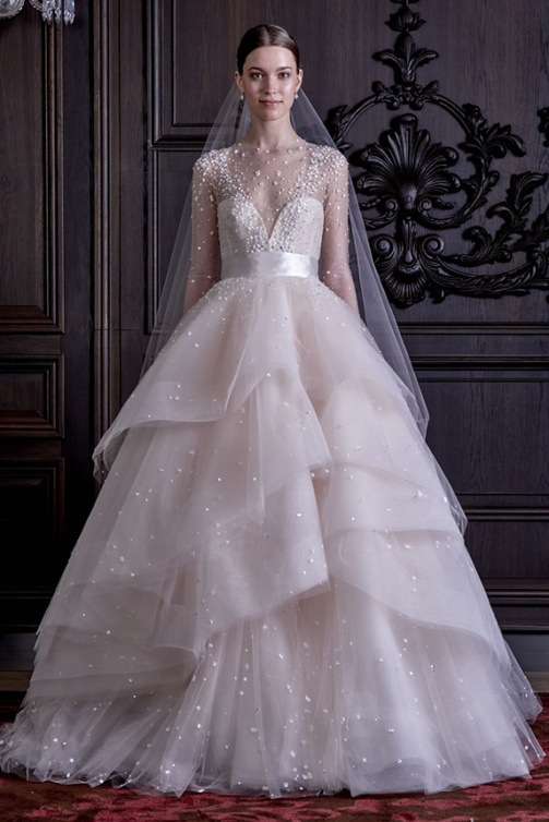 لدينا فستان زفاف "مونيك "ويلييرMonique Ihuillier " بستايل "Ball Dress"، تم تصميمه من قماش التل المزركش وأكمام طويلة بلون وردي متوهج مع تنورة جميلة على شكل طبقات ما أضفى حلة جميلة وفخمة على الفستان و زاد من تألقه ورونقه.