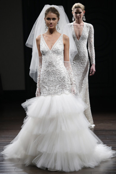 تواصل قصة حورية البحر احتلال مكانها بين صيحات موضة فساتين الزفاف؛ و سنعرض موديلات لهذه التصاميم المبهرة. لدينا قطعة من "نعيم خان Naeem Khan" تزخر بالكثير من الزخرفة في تقويرة العنق مع طبقات من الكشاكش التي زينت الفستان وأبرزت قصة حورية البحر بشكل جميل.