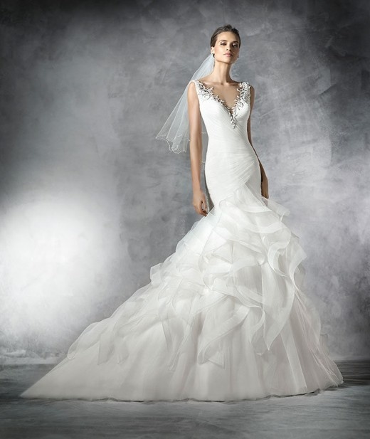 أما فستان "بريشيوس Precious" من "برونوفياسPronovias " فقد جاء أنيقا جدا بقصة لحورية البحر من قماش التل مع تقويرة V للعنق؛ مرفوق بطرحة يصل طولها إلى الكوعين في حلة عصرية وأنيقة للغاية.