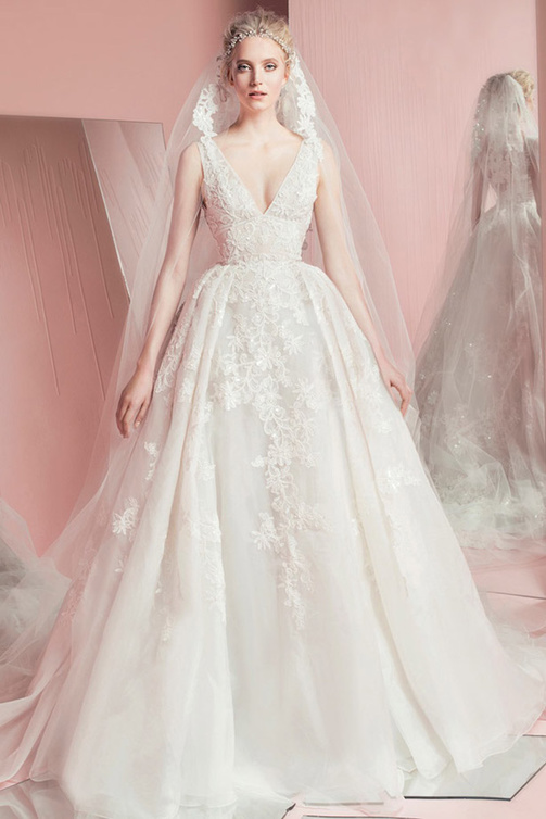 اخترنا أيضا فستان زفاف آخر بنفس الموديل (Ball Dress) من "زهير مراد"؛ ويتميز بحلة رومانسية من الدانتيل الأبيض ويتألق بتقويرة ناعمة و بسيطة على شكل V جائت في تناغم تام مع باقي تفاصيل الفستان  وزركشته.