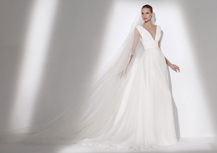 الفستان من توقيع صعب لدار  Pronovias  وهو بعيد عن الشك والتطريز، يعتمد بجماله على قماش الساتان  الناعم والقصة التي تبرز رشاقة الجسم .