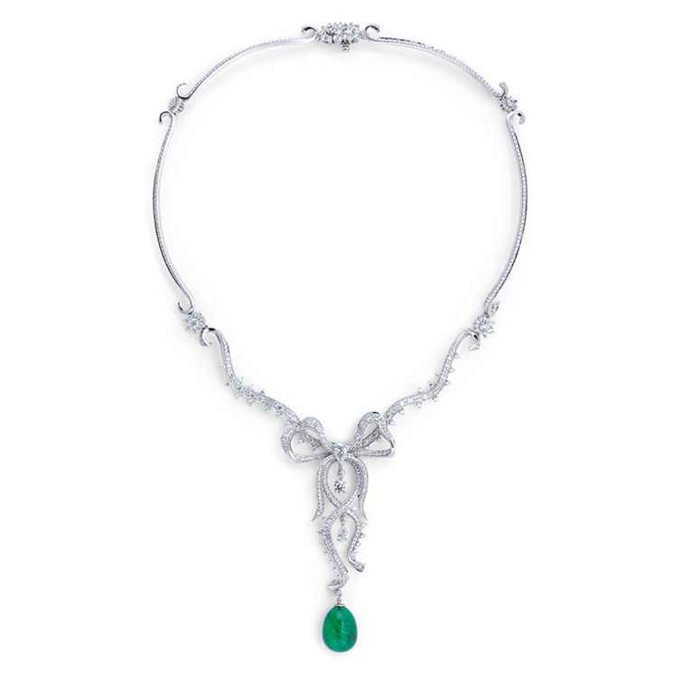 ومن دار Faberge للمجوهرات الراقية اخترنا قلادة قمة في الأناقة والنعومة تحاكي اناقة الفستان وبجماله وبلمسات الياقوت والماس .