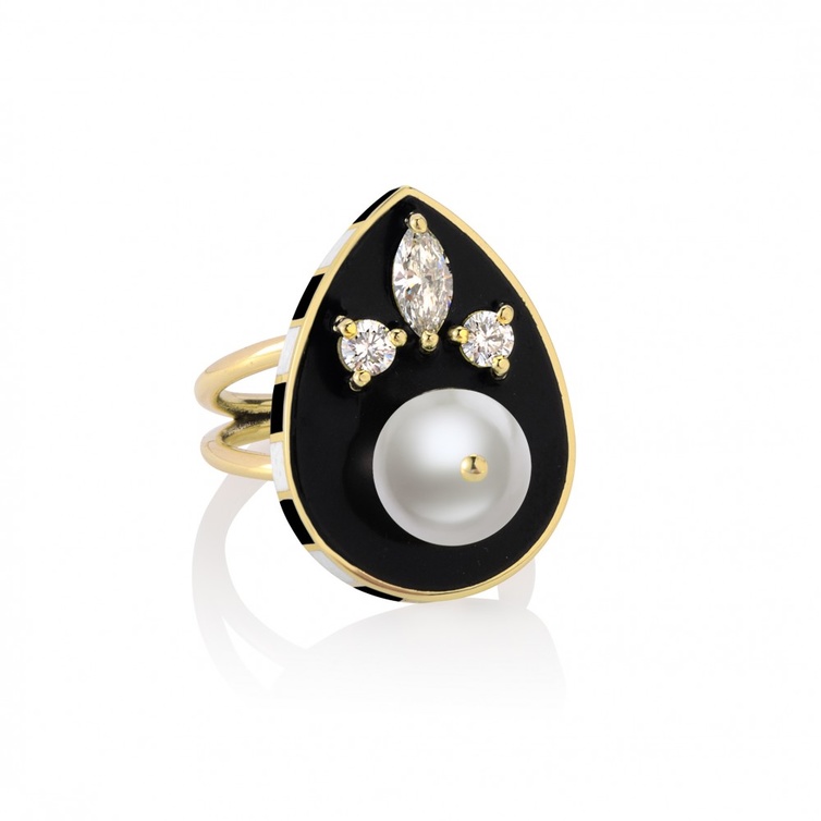 وجذب انتباهنا أيضا خاتم من "هولي ديمينت Holly Dyment" يعرف بإسم خاتم "اللؤلؤ الأسود Pearl Black ". قد يبدو بسيطا في شكله ولكنه يتميز بتوليفة رائعة للألوان تدمج بين مينا سوداء و قطعة ماسية ماركيزية مع قطعتين ماسيتين بشكل دائري بالإضافة إلى حبة اللؤلؤ التي تتمركز وسط هذا التصميم المبتكر.